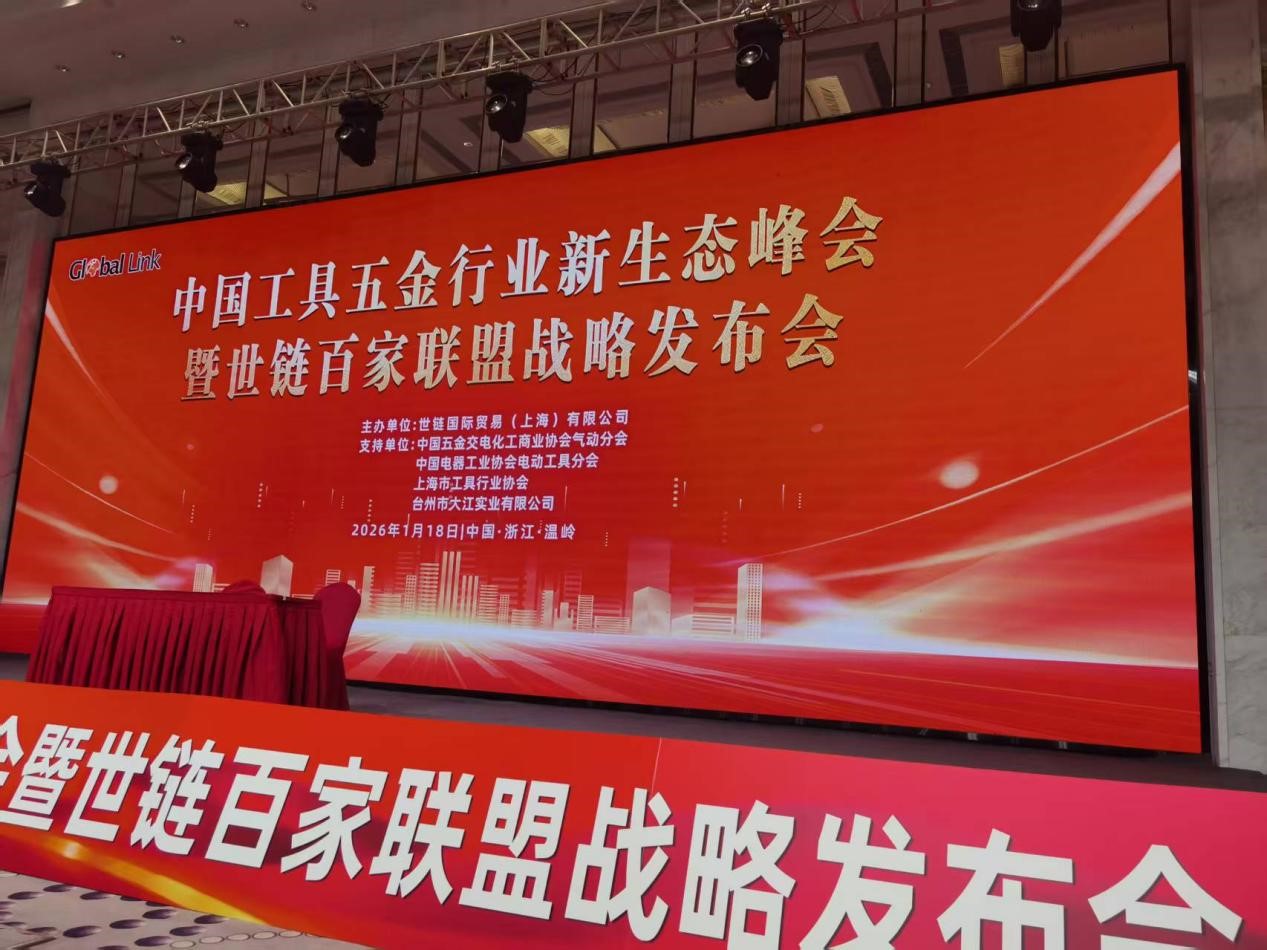1月18日下午,中国工具五金行业新生态峰会暨世链百家联盟战略发布会在浙江温岭国际大酒店成功举办。本届峰会由世联(上海)国际贸易有限公司主办,中国五金交电化工商业协会气动分会、中国电器工业协会电动工具分会、上海市工具行业协会、台州市大江实业有限公司等单位支持。中国五金交电化工商业协会理事长王家生,专职副理事长白京伟,副理事长周德益、杨明军、李明太、贾建宇、柯国权等协会领导,以及中国电器工业协会电动工具